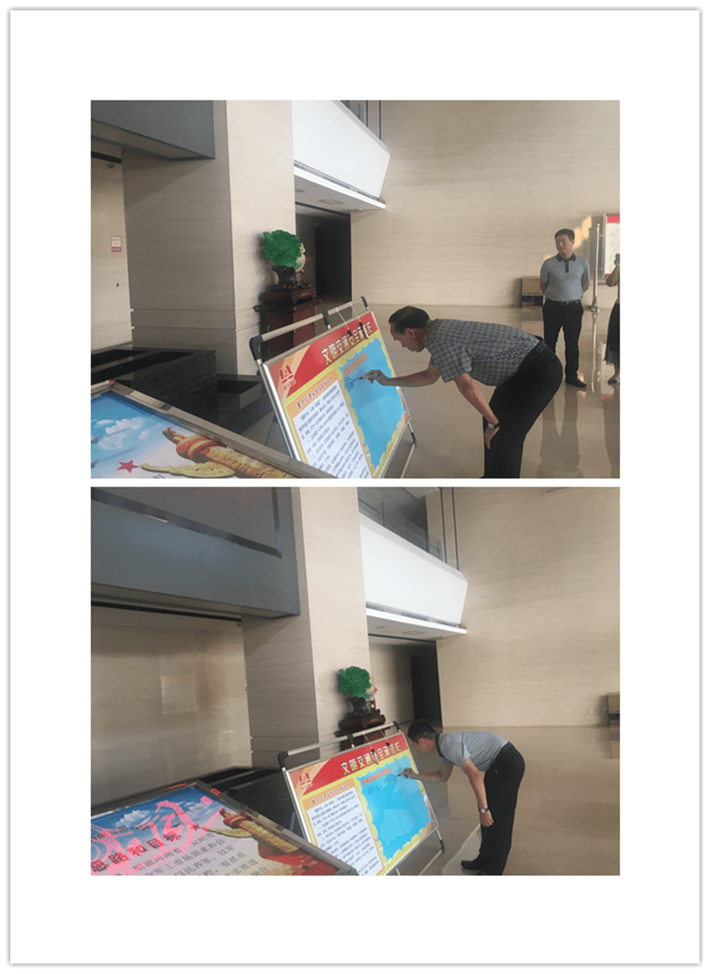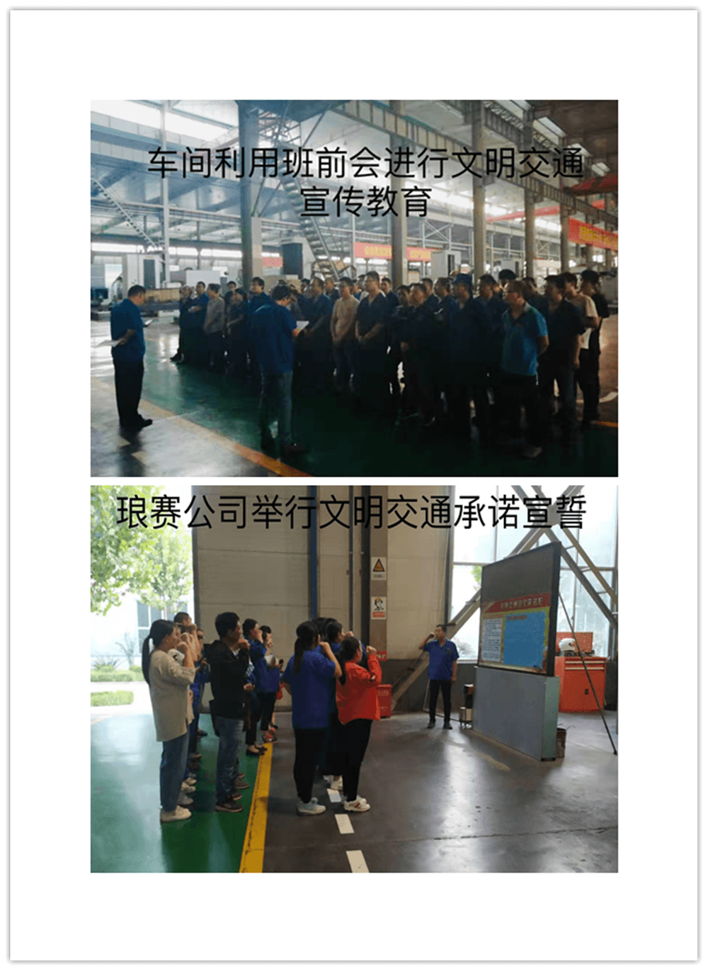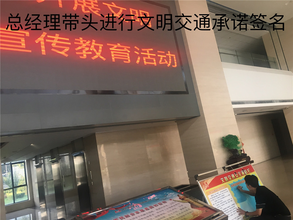 簽訂“遵守交通安全法規(guī)承諾書”。公司制作了“遵守交通安全法規(guī)承諾欄”版面十余塊,擺放在醒目位置,以部門為單位,每位員工在版面上進行簽名承諾。公司總經(jīng)理郭釧帶頭在《文明交通承諾欄》上簽名,其他領(lǐng)導和部門員工也陸續(xù)進行了簽名,通過交通安全承諾簽名,使每位員工時刻提醒自己,履行自己承諾。