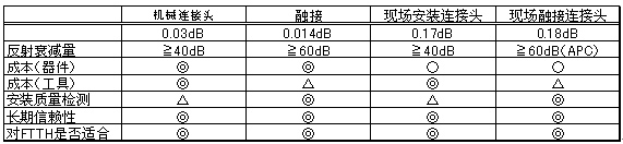 表1 各種接續方法的比較各種接續方法都嚴格符合IEC,Telcordia的機械/環境實驗標準,具有長期穩定性和可信賴性。隨著光纖接入網絡越來越復雜化,更換,維修,管理的成本不斷增加。機械接續的廣泛應用能夠大大減縮成本,因此今后機械連接器,現場安裝連接頭和現場融接連接頭的使用必將得到更大的發展。